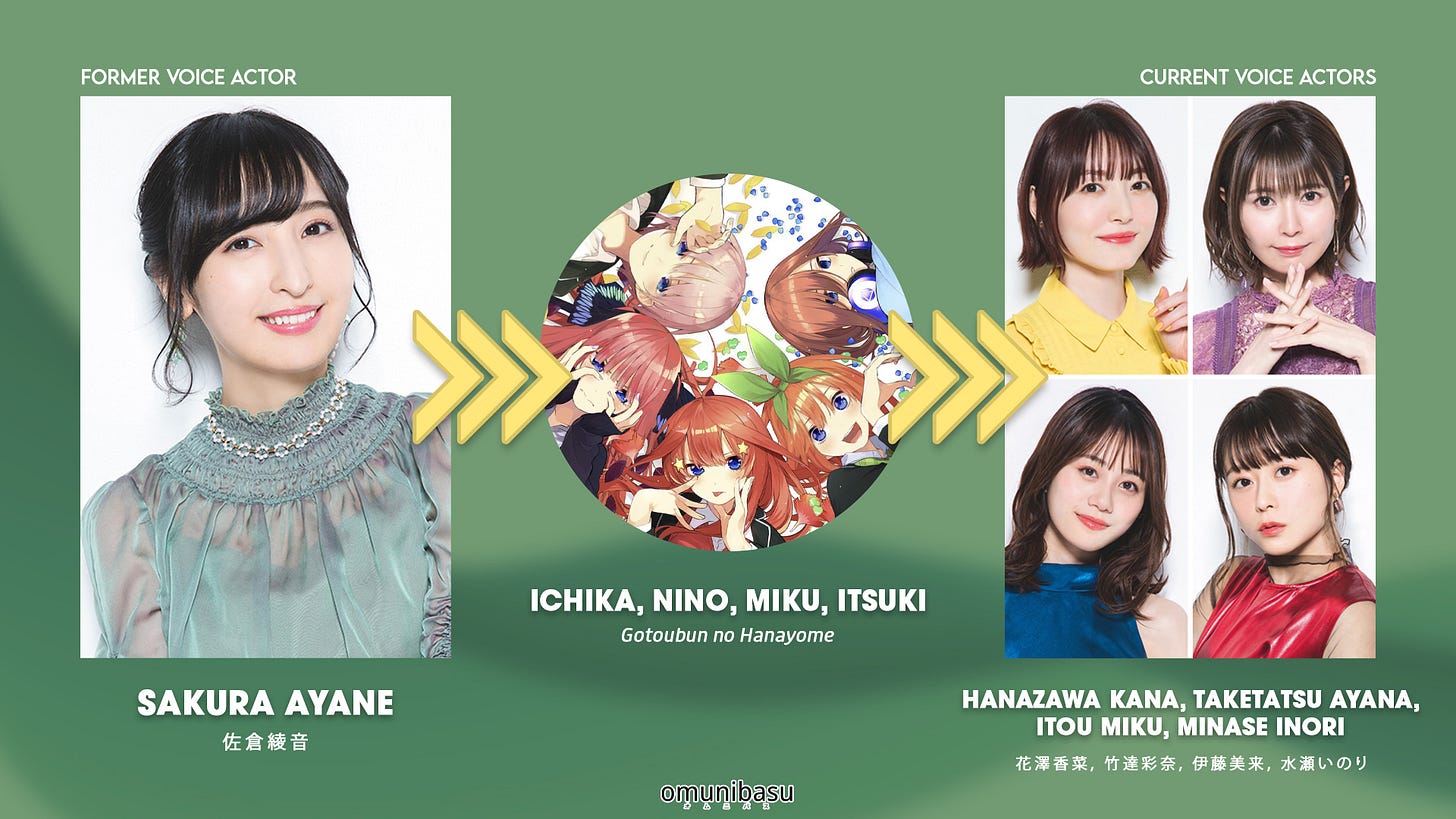 Current Voice Actors: Hanazawa Kana (Ichika), Taketatsu Ayana (Nino), Itou Miku (Miku) and Minase Inori (Itsuki)